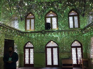 Der Nachmittag gehört uns. Für nur zehn Euro mieten Walter und ich uns ein Taxi für den ganzen Nachmittag. Verglichen mit Deutschland ist Taxi fahren in Iran günstig. Zuerst bringt uns der Taxifahrer zu einem shiitischen Heiligtum. Eh’ ich mich verseh’ steck’ ich in einem bunten Blümchentschador aus Baumwolle. Durch den Fraueneingang komme ich in das Innere, wo es mir von der glitzernden Pracht der vielen Spiegelmosaike wieder einmal die Sprache